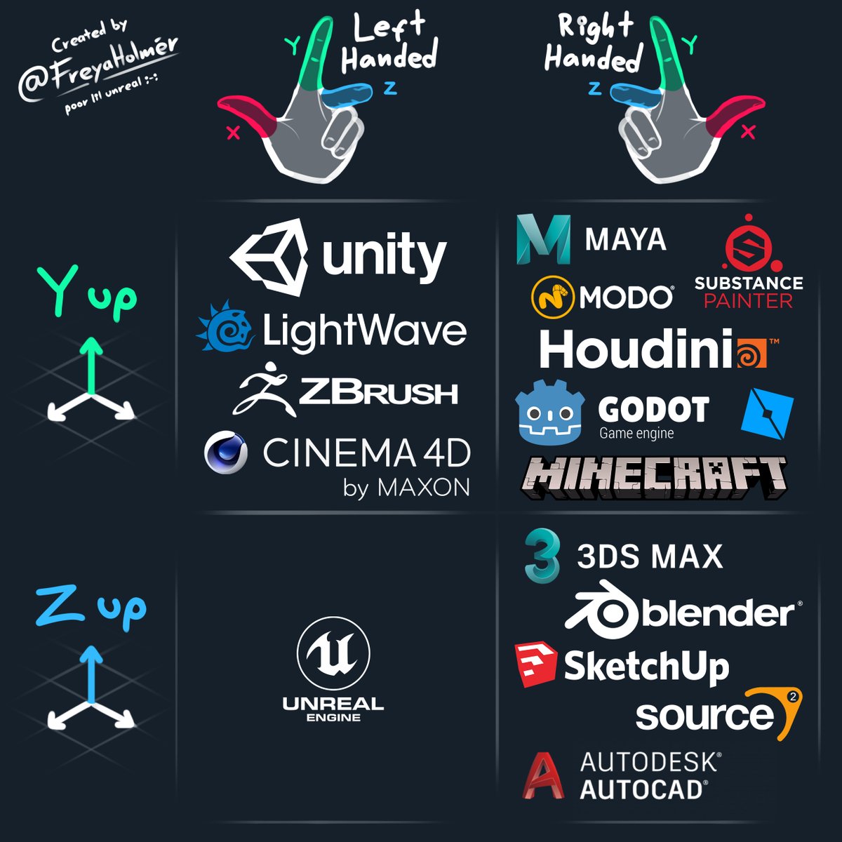 - Z-Up:Z轴的正方向为“上”。这在建筑和CAD领域以及某些3D引擎(如Unreal Engine)中更为流行。